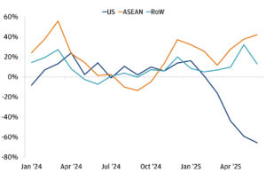 China has managed to preserve its global market share by shifting exports toward ASEAN countries and other regions, reducing its dependency on the U.S. market. According to JPMorgan, China’s actual exports are projected to grow about 8% in 2025, with its global export share rising to 15%. In contrast, exports to the U.S. have fallen below 10% of total exports, reflecting this structural shift.