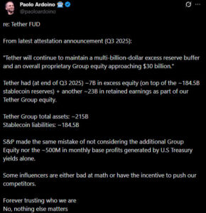 CEO Paolo Ardoino, addressing the issue, emphasized that critics were overlooking not only Tether’s reserves but also the company’s strong consolidated equity position. Referring to Tether’s Q3 2025 attestation report, Ardoino shared the following figures: