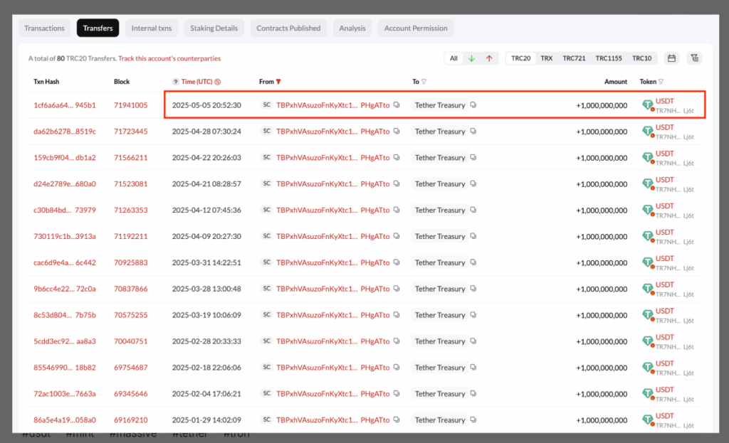 Tether’s move injects significant liquidity into the crypto market. Historically, USDT minting has often signaled price surges for Bitcoin and other cryptocurrencies. For instance, in 2024, Tether’s minting of 31 billion USDT played a key role in Bitcoin’s jump from $27,000 to $73,000. The current minting strengthens expectations of a new market rally.