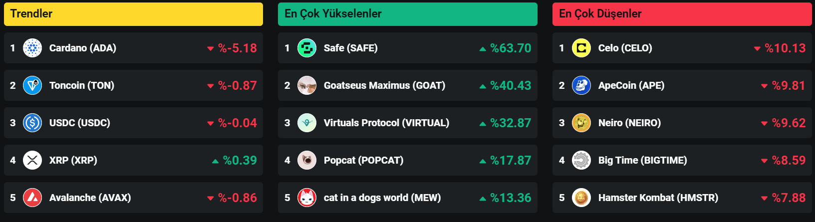 In the last 24 hours, the trendiest coins in the crypto market are Cardano (ADA), Toncoin (TON) and XRP. The biggest risers are Safe (SAFE), Goatseus Maximus (GOAT) and Virtuals Protocol (VIRTUAL). The biggest fallers in the market are Celo (CELO), ApeCoin (APE) and Neiro (NEIRO).