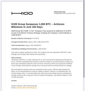 With the latest purchase, H100 Group’s total Bitcoin holdings have reached 1,004.56 BTC, marking the company as a key player in the crypto market.