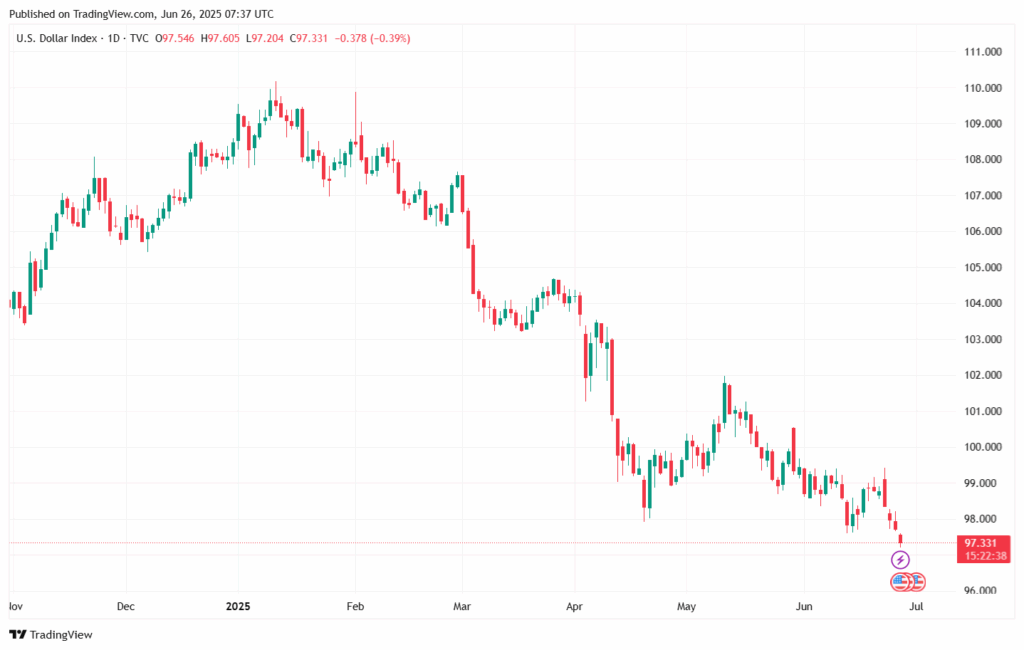 The US Dollar Index (DXY) dropped to 97.2, its lowest point since February 2022. Despite escalating geopolitical tensions between Iran and Israel, the dollar failed to maintain its traditional safe haven status. This has accelerated the search for new safe havens by investors.
