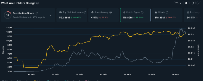 Stalkchain data shows one wallet accumulated $226,000 worth of PUNCH. Nansen reports that public figure holdings increased 89.69% in the past 7 days, while whale holdings declined—curious.