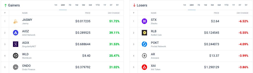 Jasmy: Jasmy’s native token rose 51.72%. Aiming to bridge the gap between the physical and digital worlds, Jasmy leverages the Internet of Things (IoT) to create a secure and decentralized data marketplace. Its native token, JMY, fuels this platform, enabling data monetization and efficient data exchange.