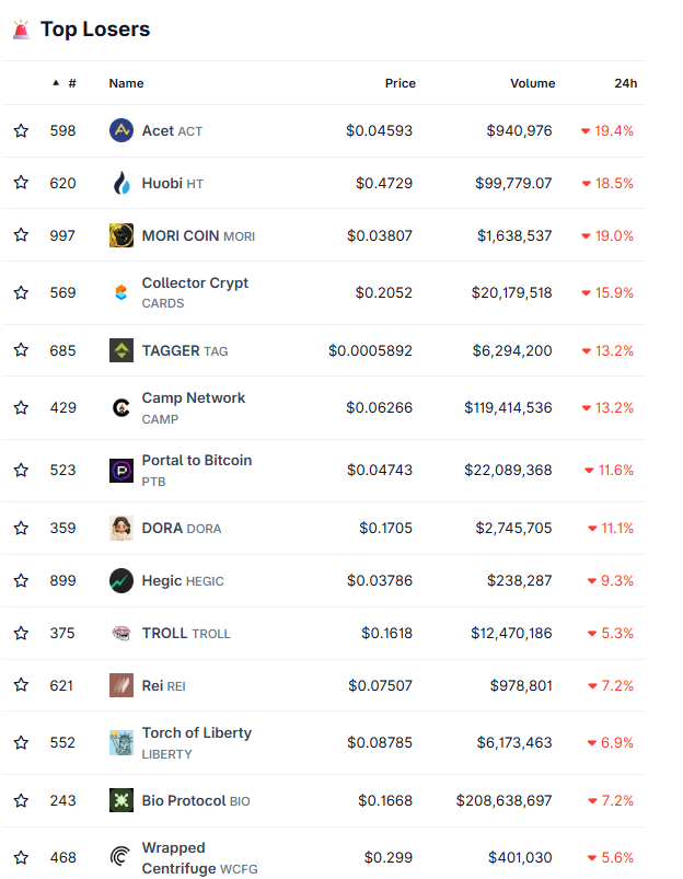 According to Coingecko, some crypto lost significant value this week. Acet (ACT) led the decline with a 19.4% drop, trading at $0.04593. Mori Coin (MORI) fell 19% and traded at $0.03807. Huobi (HT) dropped 18.5% and is priced at $0.4729. Collector Crypt (CARDS) lost 15.9%, reaching $0.2052.