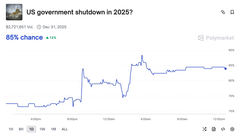 Polymarket data shows an 85% chance of a US government shutdown. Vice President JD Vance stated, “I think we are headed for a shutdown.” Analyst Amit Investing highlights two possible scenarios: