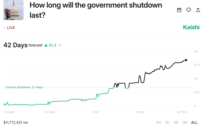 The ongoing U.S. government shutdown, now exceeding 40 days, is set to become the longest in history. This prolonged closure is delaying several pending crypto ETF approvals, even as investor demand continues to grow. According to Kalshi data, there’s a 53% chance the shutdown could extend to 42 days, further stalling approvals for XRP ETFs, staked Ethereum (stETH) ETFs, and leveraged HYPE ETFs currently under SEC review.