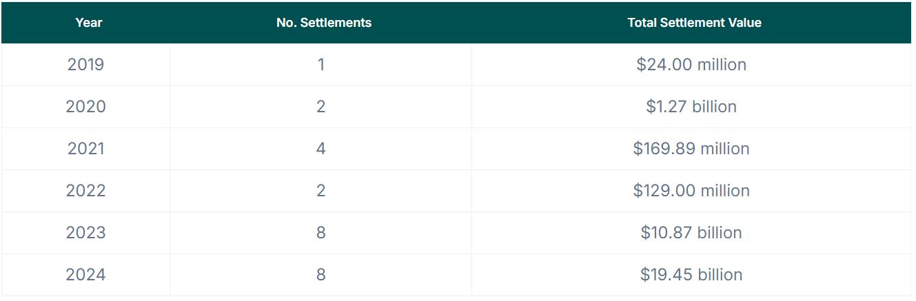 In 2024, eight separate settlements saw regulators collect 78% more payments than the $10.87 billion collected in 2023. This represents a massive 8,327% increase over 2022. These settlements include forfeitures, restitution, civil penalties, and interest, but do not include lawsuits against individual executives.