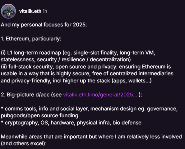 According to his post on Warpcast, Buterin’s top priority for 2025 is further development of the Ethereum Layer 1 (L1) network. His goals in this area include: