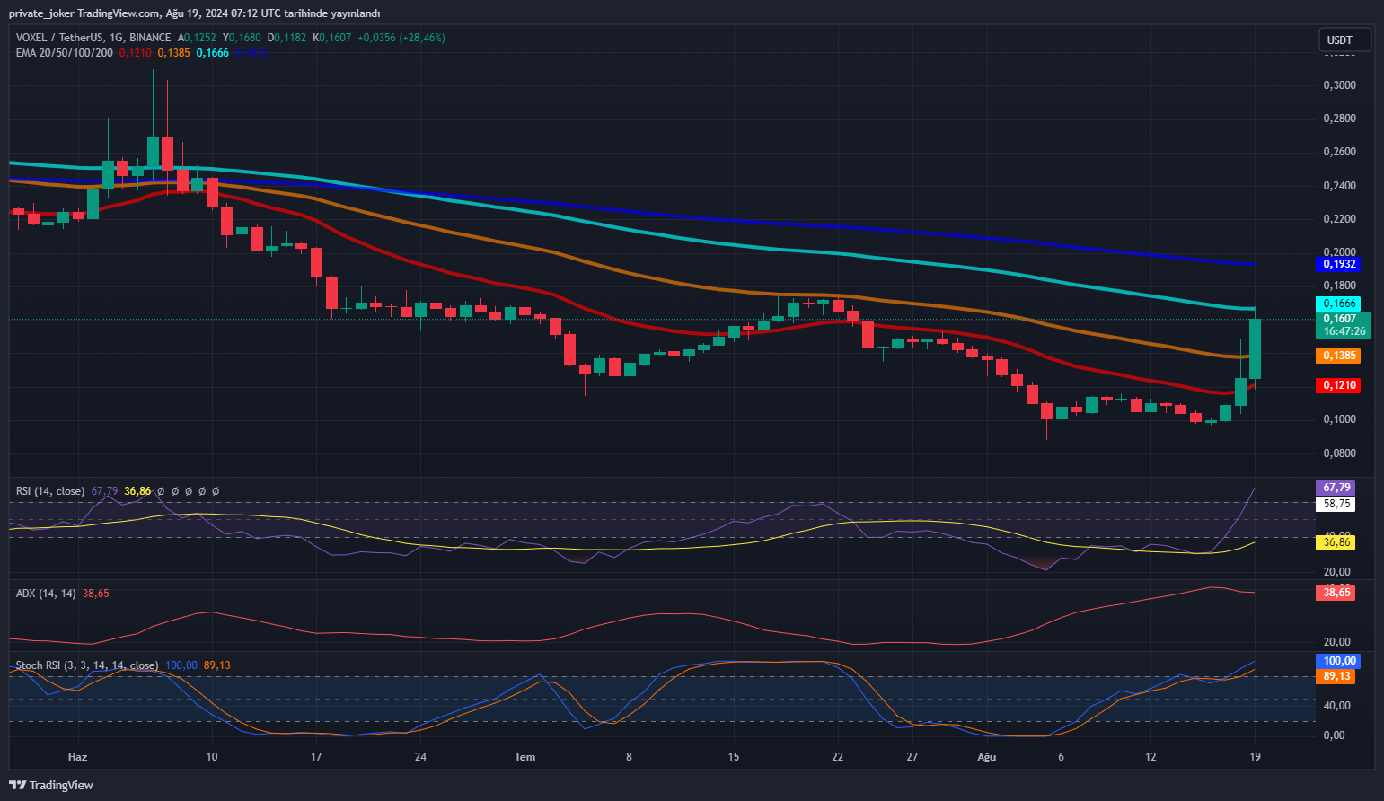 - STOCH (9,6) and STOCHRSI (14): The Stochastic Oscillator and Stochastic RSI show mixed signals, with the former indicating a sell and the latter an overbought condition. This suggests that VOXEL might be overextended in the short term.