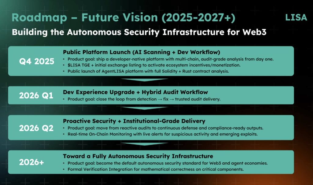 • 2025 Q4 – Public Launch: Multi-chain support, Solidity & Rust contract analysis, $LISA TGE, exchange listings