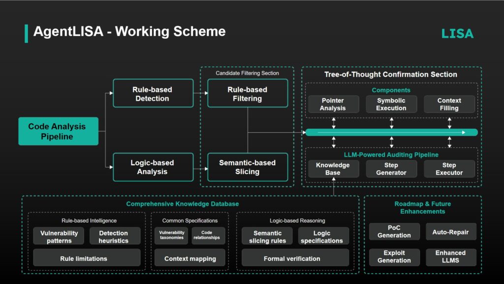 AgentLISA analyzes complex smart contracts using a multi-layered architecture with a Tree-of-Thought mechanism, combining rule-based pre-scans with LLM-powered symbolic execution and logical validation.