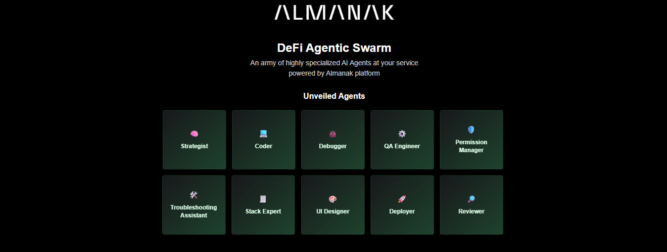 At the heart of Almanak is an Agent Swarm composed of multiple AI agents. These agents collaboratively handle research, coding, testing, optimization, risk management, and deployment processes. The platform also provides:
