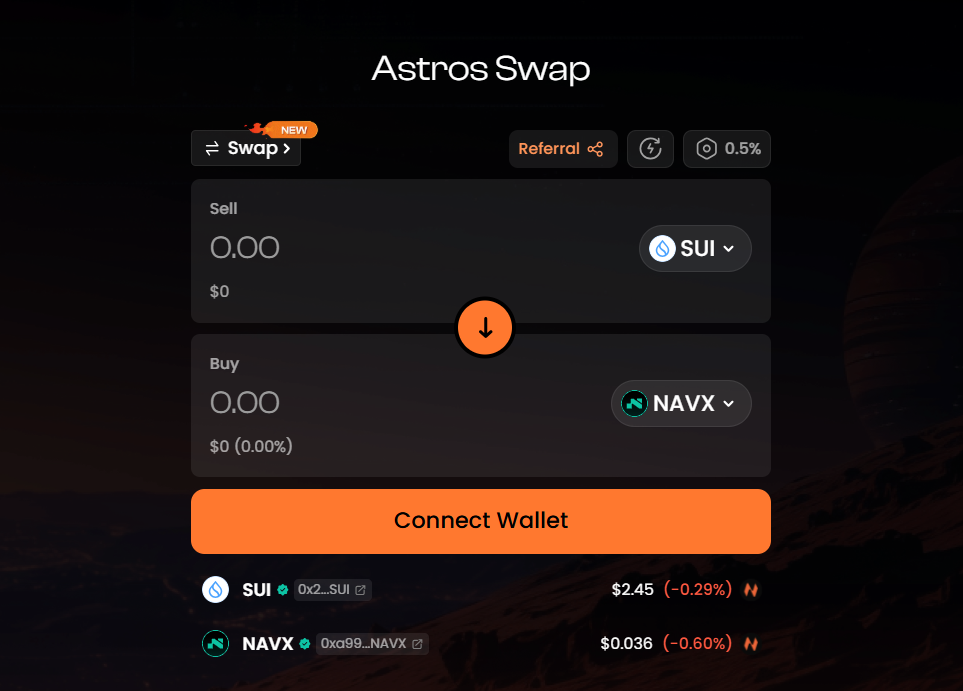 Astros DEX is a decentralized cryptocurrency exchange built on the Sui blockchain. It works as a DEX Aggregator, combining multiple liquidity pools to offer users the best price. Astros also supports token swaps for NAVX and other tokens, as well as perpetual trading.
