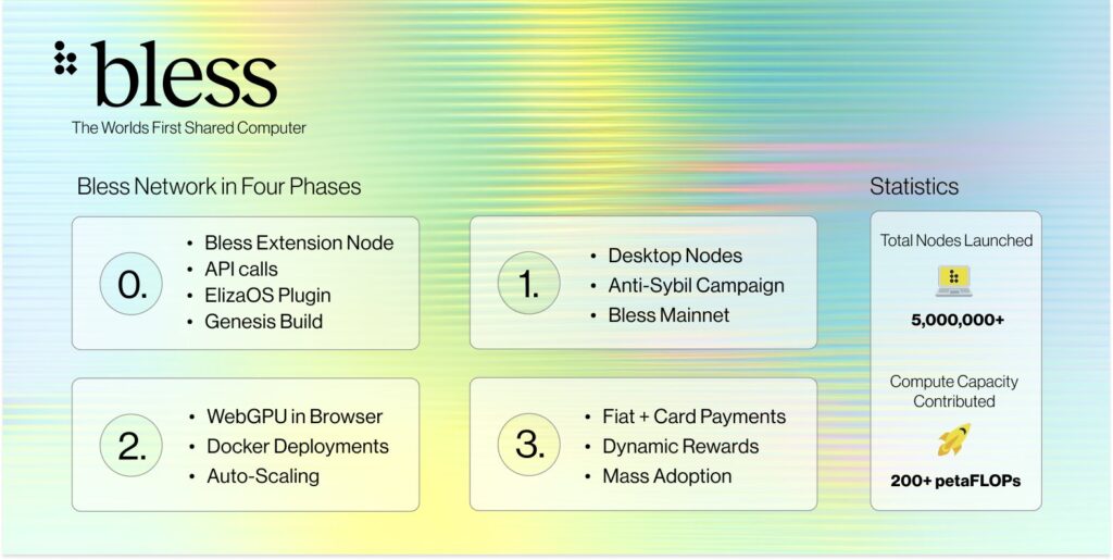 Bless Network is a decentralized edge computing platform that transforms the idle processing power of everyday devices (laptops, desktops, mobile devices) into a global “shared computer” network. Founded in 2022 in San Francisco as “Blockless,” the project had validated over 5 million nodes on its testnet by 2025. Bless aims to reduce reliance on centralized cloud providers, especially for AI and blockchain applications.