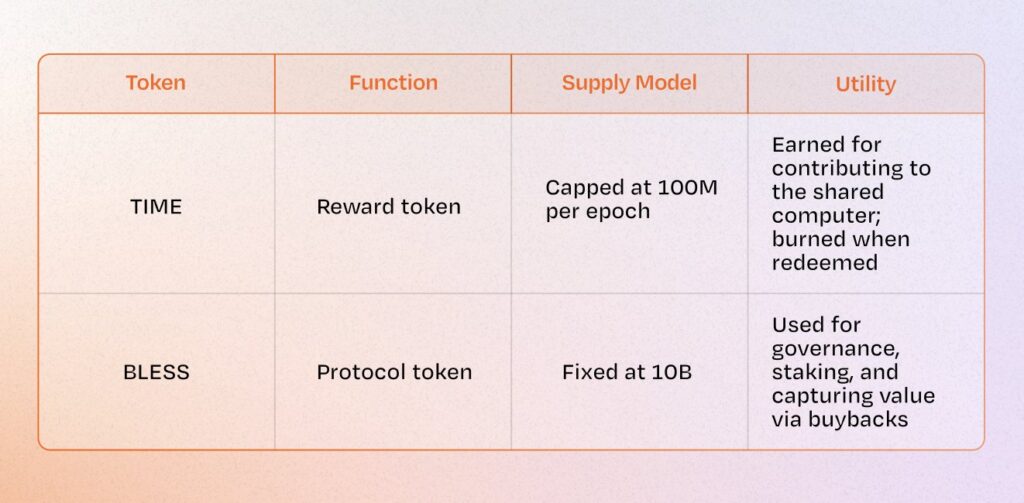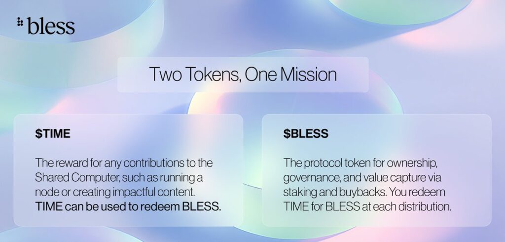 TIME is a reward token with no governance role. It is earned by running nodes or contributing to the network and can later be converted into BLESS and burned.