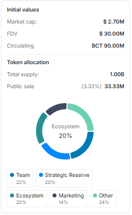 - Initial circulating supply: 90,000,000 BCT