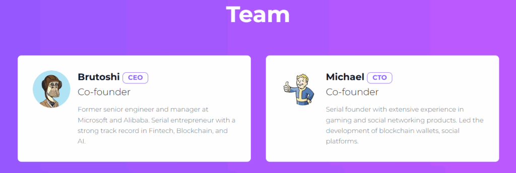 • Brutoshi – CEO, Co-founder: Former senior engineer and manager at Microsoft and Alibaba, serial entrepreneur with extensive experience in fintech, blockchain, and AI.
