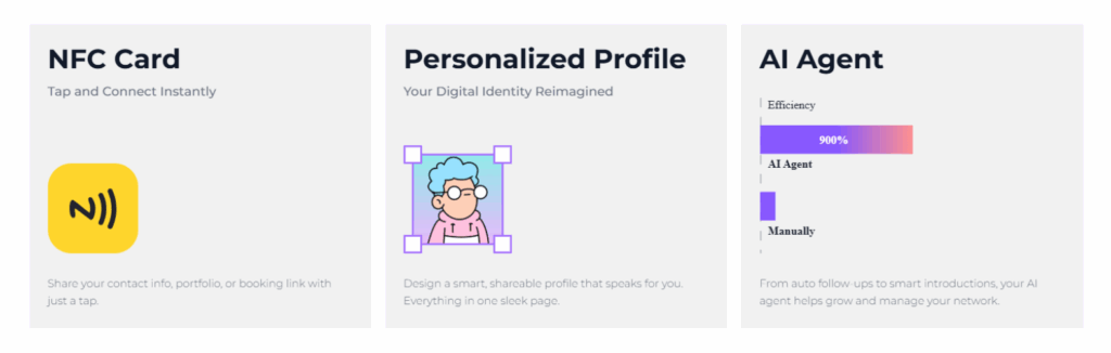 • AI Agent: Automates networking tasks, from follow-ups to smart introductions, targeting up to 900% efficiency gains compared to manual methods.