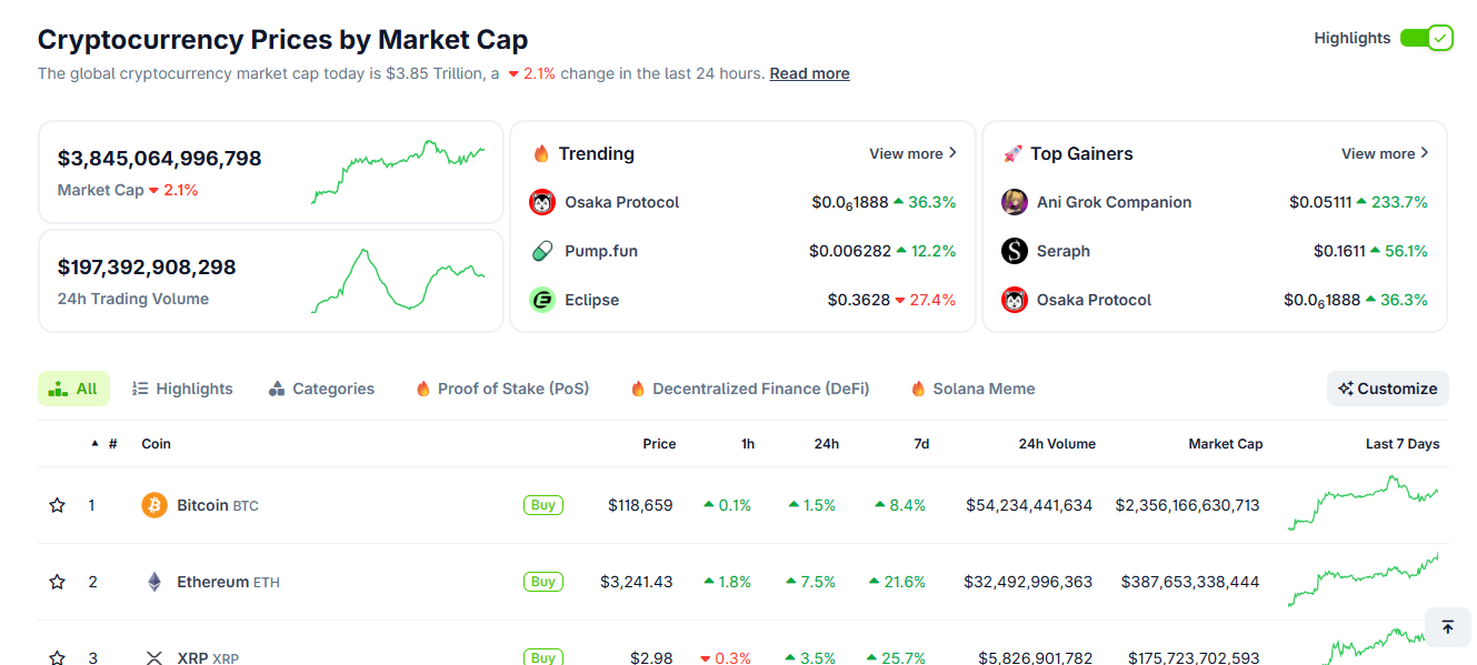 The homepage is CoinGecko’s most visited section, attracting millions of users monthly. It displays the top 100 cryptocurrencies by market capitalization, along with their current prices. You’ll also find an overview of the total crypto market cap and 24-hour trading volume, as well as trending coins and top gainers or losers.