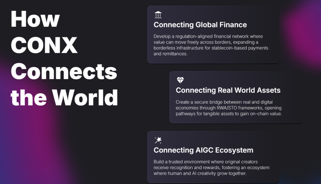 XPLA starts from a clear problem: the blockchain space hosts countless applications, but most are abandoned quickly. A large share of gaming and NFT projects lose users after the initial hype fades. The architecture targeted by CONX is built around enabling capital flow between traditional finance (TradFi) and decentralized finance (DeFi), aiming to create a borderless, multi-sector digital economy.