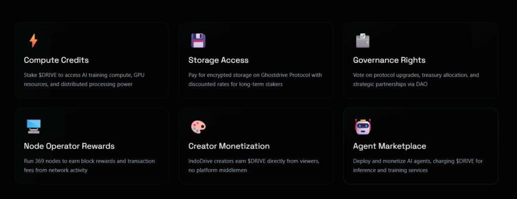 - Compute Credits: Stake DRIVE to access AI training, GPU power, and distributed compute.