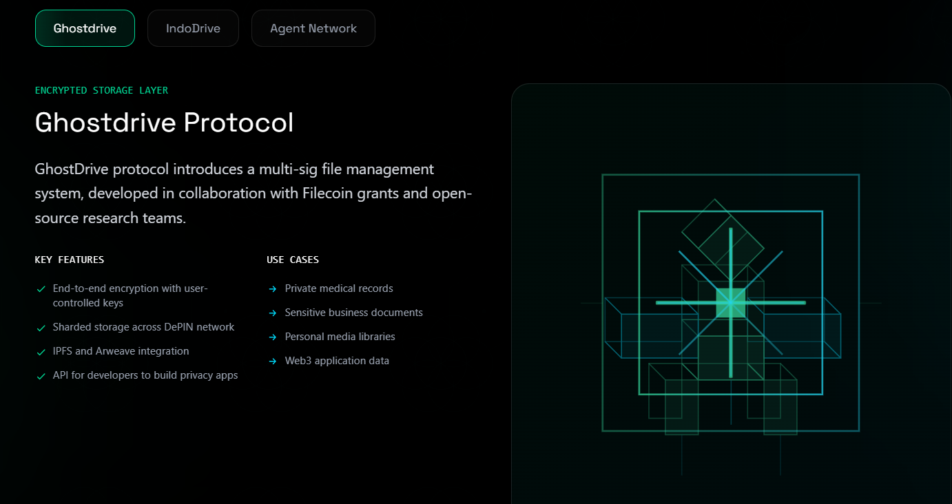GhostDrive (Storage and Privacy): Data is stored under multi-sig control with end-to-end encryption. Files are distributed across the DePIN network, Filecoin, and Arweave. DRIVE tokens are used for storage and API access.