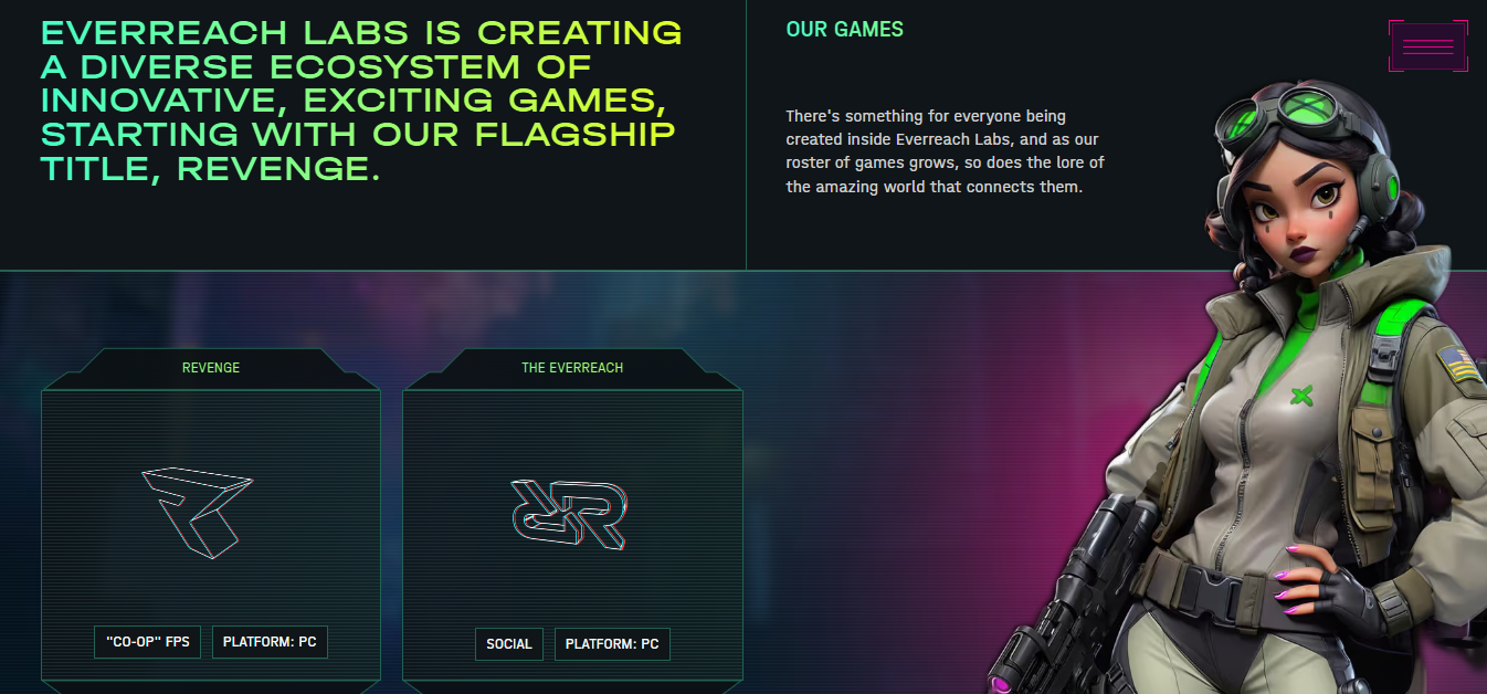 The first and flagship product of the Everreach Labs ecosystem is the first-person shooter (FPS) game called REVENGE. This game has been developed with a design centered on viewer interaction.