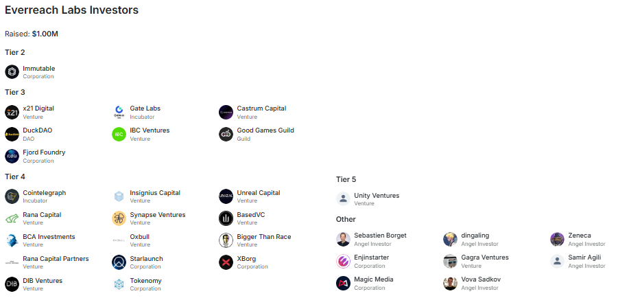 The Everreach Labs project has received support from various investment funds, gaming ecosystems, and blockchain-focused venture capital companies. The project has raised approximately 1 million dollars in total investment.