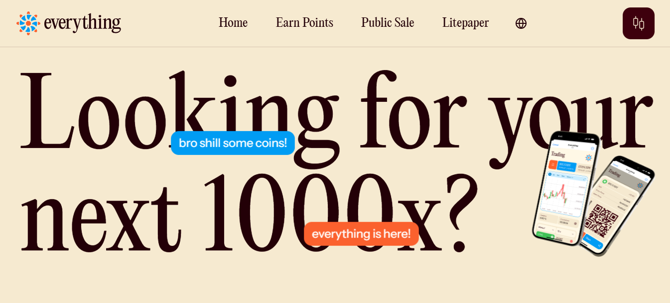 Everything (E) is a trading application positioned as a multi-surface transaction platform integrated with Telegram infrastructure, offering users perpetual futures trading with up to 1000x leverage. The platform enables trading across different asset classes, including crypto, stocks, and commodities, while aiming to unify spot markets, futures trading, prediction markets, and payment systems under a single roof with a one-account and one-balance model.