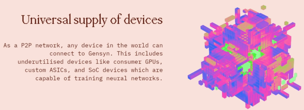 Gensyn is a protocol that connects computers worldwide to create a decentralized machine learning (ML) network. Its goal is to run ML tasks consistently and verifiably on any device, enabling AI systems to scale beyond the limitations of centralized infrastructures. Built on an Ethereum-based rollup, Gensyn operates through four core components: consistent ML execution, trustless verification, peer-to-peer communication, and decentralized coordination.