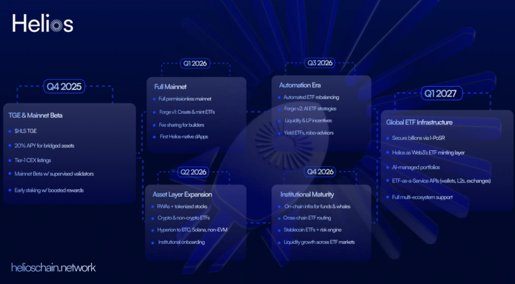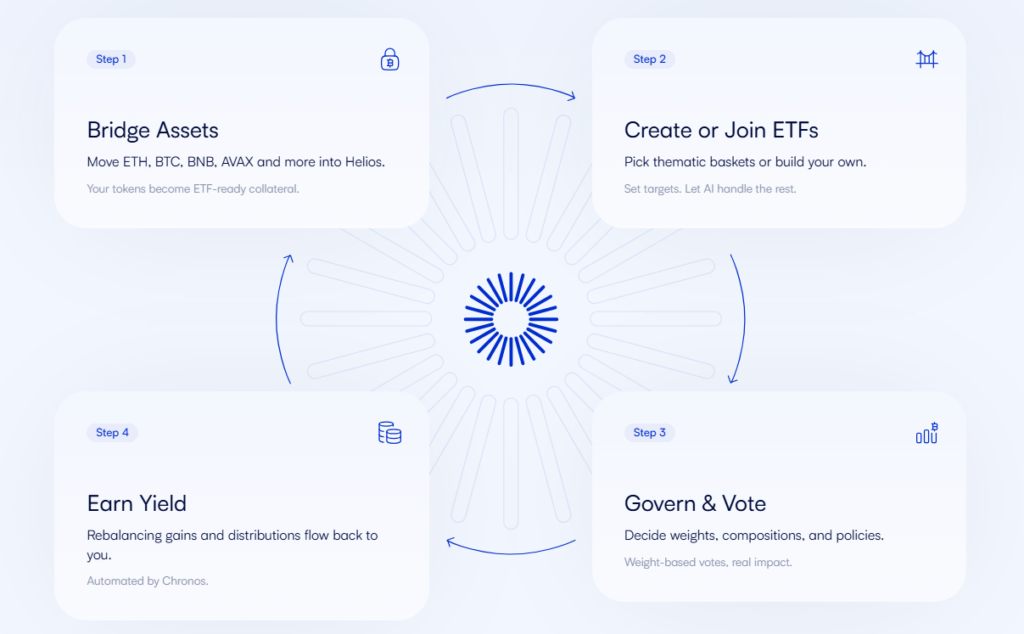 Helios Blockchain is a Layer-1 network designed for creating, managing, and automating on-chain portfolio products such as index funds, ETFs, and multi-asset strategies. Its goal is to unify assets across multiple blockchain ecosystems under a single logic and accounting framework.