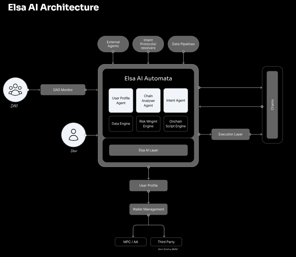 HeyElsa operates with AI Automata, an intent-based architecture. Natural language commands (e.g., “Stake ETH on Base”) are interpreted by the Intent Agent into actionable plans. The Chain Analyzer identifies optimal routes and liquidity, the Risk Management Engine ensures safety, and the Execution Layer completes transactions across chains in seconds.