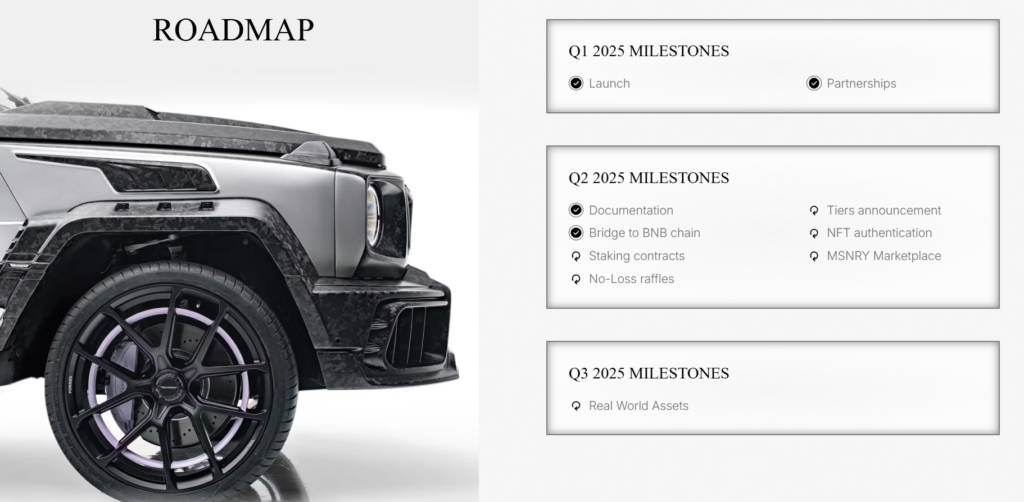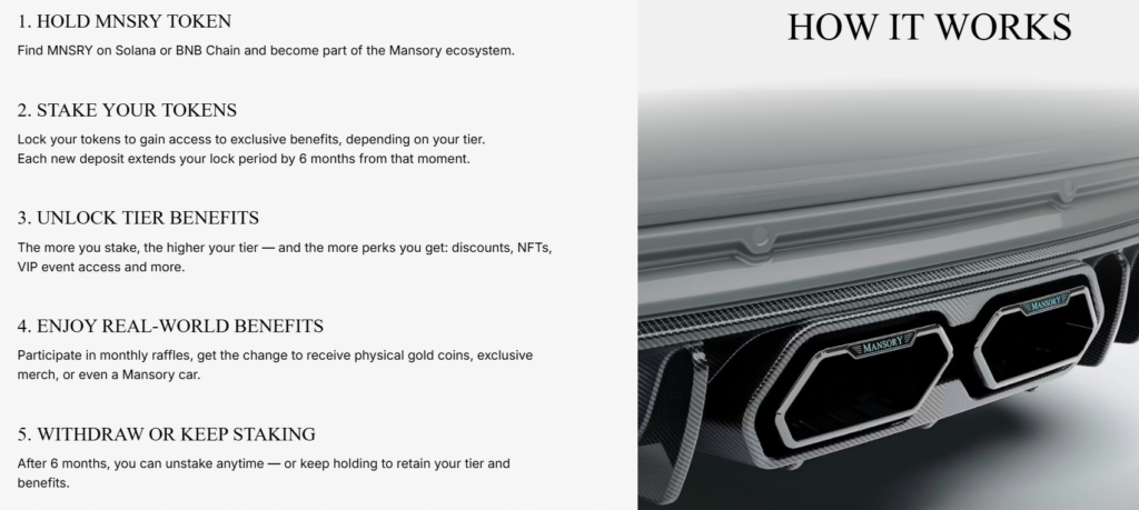 Mansory (MNSRY) is a utility token centered around luxury automotive culture and high-quality lifestyle. It is not just a digital asset but also a membership key to the Mansory world. It operates on both BNB Chain and Solana in a multi-chain structure.