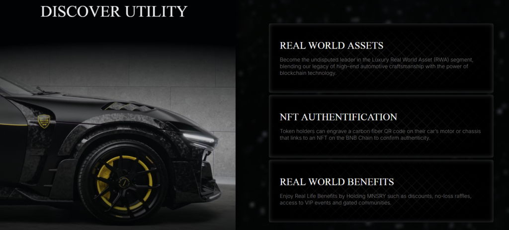 The project is based on combining physical luxury with digital privileges. MNSRY token holders participate in the ecosystem through: