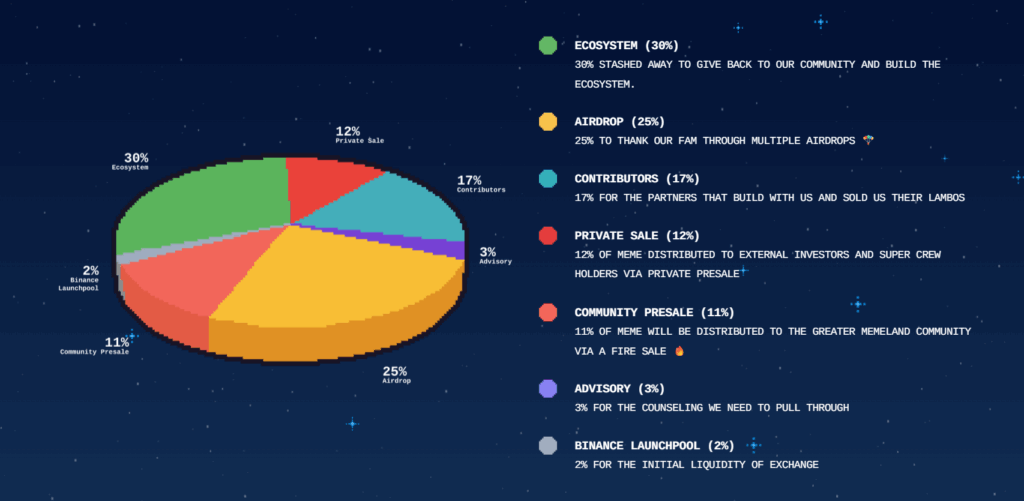 Memecoin is part of the Memeland ecosystem, managed by the 9GAG team, including various NFT collections and community projects. $MEME token is positioned within this broader Memeland universe, supported by its community and activities but does not claim specific utility within the ecosystem itself.