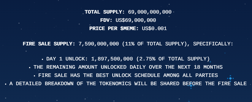 Meme Coin’s total supply is 69 billion tokens. During the presale on October 26, 2023, MEME tokens worth over $10 million were sold within an hour. The presale price was set at $0.001.
