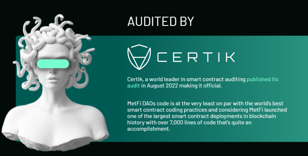 MetFi DAO smart contracts were audited by CertiK in August 2022. The system contains over 7,000 lines of code, confirmed to meet world-class blockchain coding standards.