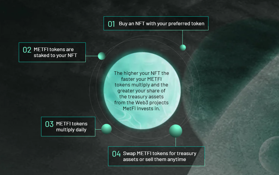 Treasury Ownership: NFT holders gain proportional shares of the MetFi treasury (investments, BTC, ETH, and cash).