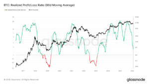 Glassnode highlights the 90-day moving average of the realized profit/loss ratio as a crucial indicator for a sustainable uptrend. On-chain data show that strong and lasting price advances— including mid-cycle recoveries over the past two years—have typically occurred when this ratio remained above the level of 5. This threshold is seen as a key reference point signaling healthy capital inflows and strengthened buying demand.