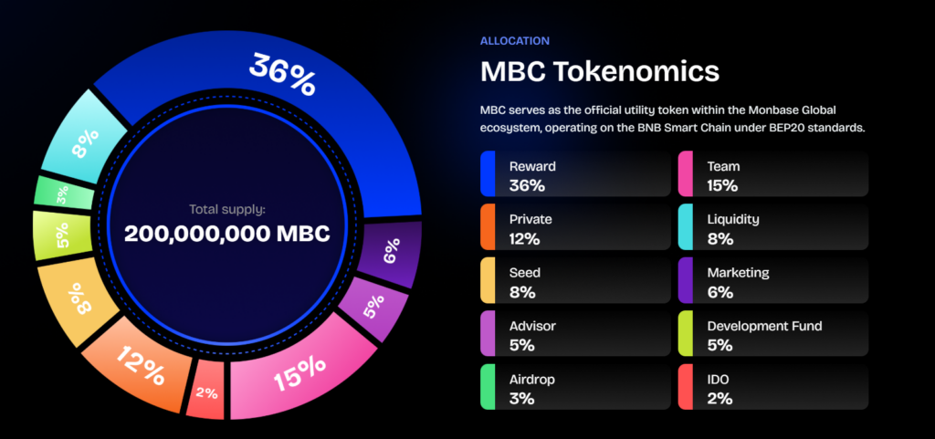Monbase Global operates as a DApp on Binance Smart Chain (BSC). Users can explore, buy, sell, and create NFTs on the NFT Marketplace. Monbase Exchange offers a secure trading platform. MBC serves as the main payment token, used in staking, yield farming, and other ecosystem activities. Regular token burns via smart contracts help reduce circulating supply.