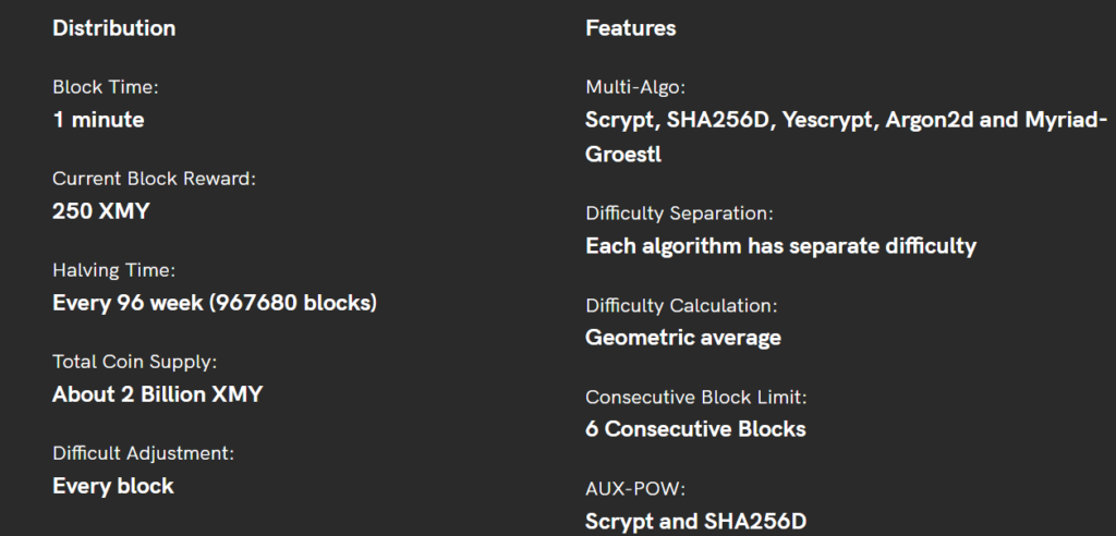 • 2016: Ticker changed from MYR to XMY and Qubit replaced by Yescrypt via mining consensus