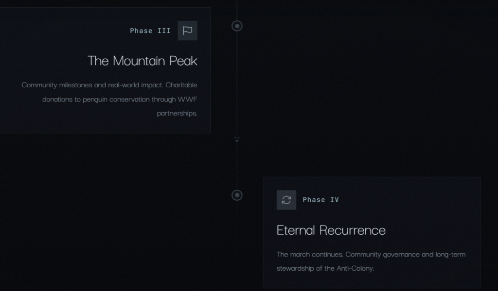Rather than a conventional roadmap, Nietzschean Penguin follows a symbolic phase-based structure.
