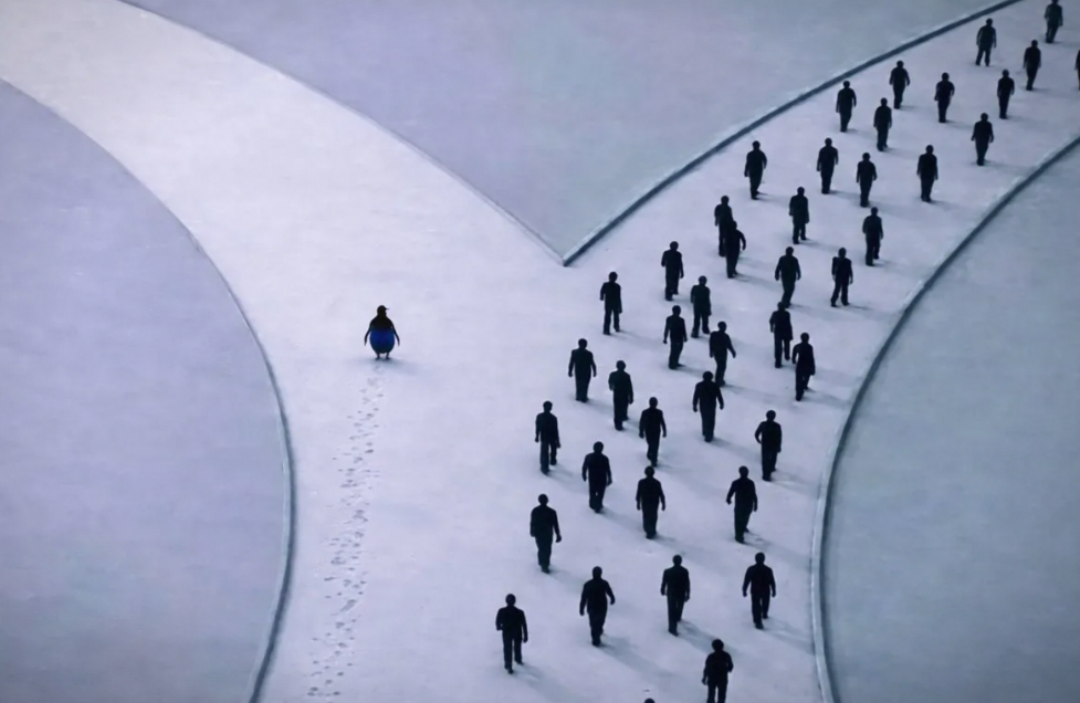 The origin of Nietzschean Penguin traces back to a scene from a 2007 documentary showing a penguin separating from its colony and walking alone toward the unknown. Over time, this scene evolved into a powerful internet metaphor symbolizing the individual’s departure from the herd.