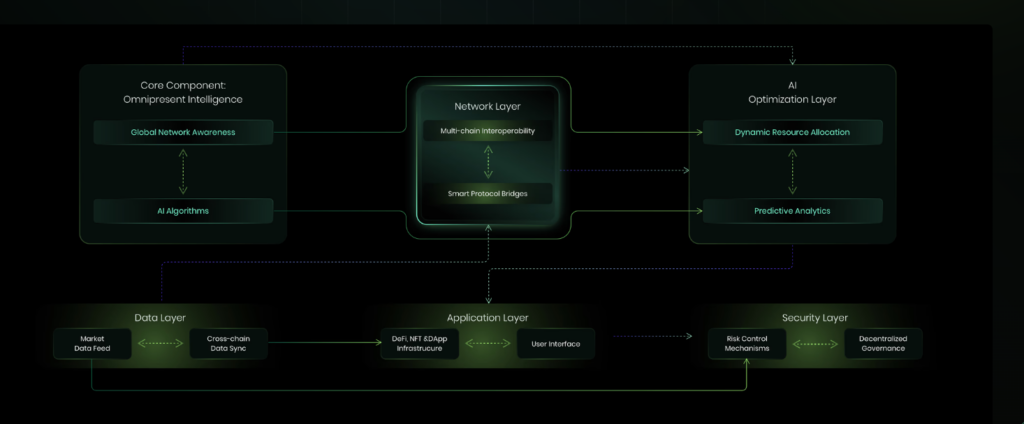 At the core of the system lies Omnipresent Intelligence, which acts as the protocol’s “brain,” continuously monitoring network activity and making optimal execution decisions. The Network Layer manages cross-chain communication and smart protocol bridges, while the AI Optimization Layer dynamically allocates resources and optimizes execution.