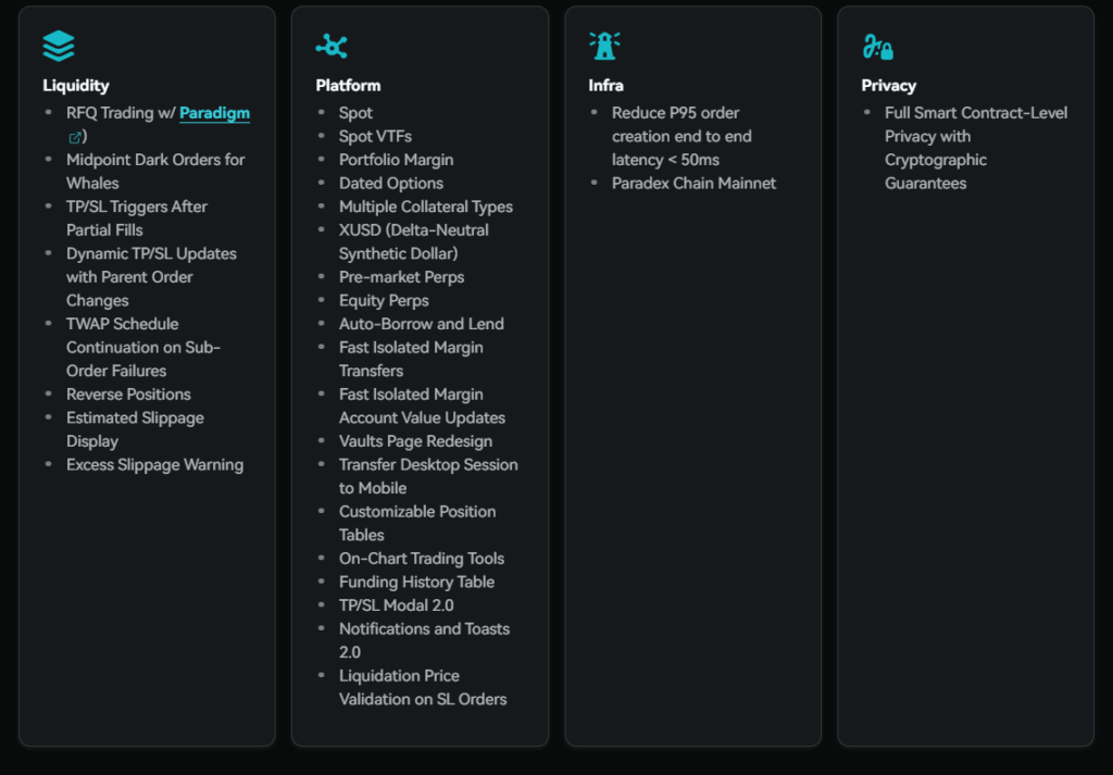 Paradex Chain is a zk-STARK-based Layer-2 on Ethereum, built on the Starknet Stack with the Cairo programming language. It processes ~1,000 TPS with 2–3 second block finality. Privacy is the key: zk encryption hides positions, entry/exit levels, and PnL. DIME serves as the native gas token. The chain will soon open to external developers connecting directly to Paradex liquidity.