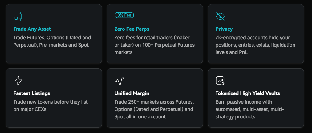 1. Trading Layer: Spot, perpetual futures, perpetual options, and assets not yet listed on CEXs can be traded through a single account. Users can switch instantly between cross, isolated, and portfolio margin modes. Over 100 markets offer zero fees for retail users.