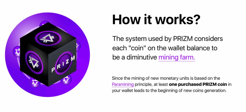 The idea behind PRIZM was to democratize crypto mining and offer an alternative to energy-intensive Proof of Work (PoW) systems. Instead of traditional mining, PRIZM introduced Paramining, a system where users earn rewards based on wallet balance and community size. This allows anyone to generate income from the network without technical knowledge, expensive equipment, or high costs.