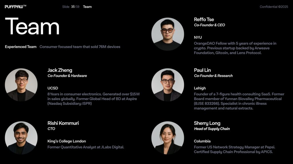Puffpaw is led by a team of high school friends. Reffo serves as CEO with extensive Web3 project experience. Jack oversees product development and has 5 years of experience in the e-cigarette industry. Paul focuses on health research and tea extract–based products. Rishi acts as CTO, handling tokenomics and Web3 design. Sherry Long is the supply chain expert. The team has also established partnerships with leading healthcare and consumer companies across APAC, North America, and Western Europe.