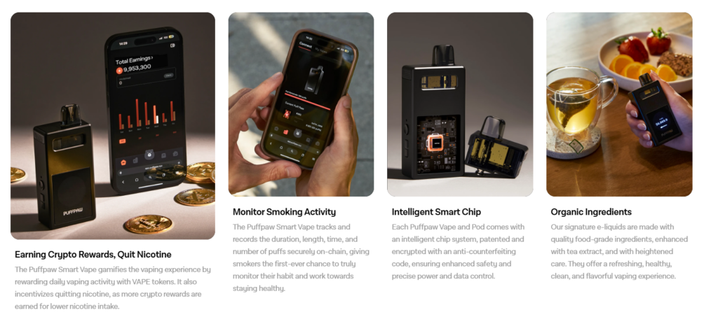 Puffpaw is a DePIN (Decentralized Physical Infrastructure Network) project running on the Berachain blockchain, using smart vape devices as physical nodes. The system tracks users’ vaping activity on-chain and rewards them with VAPE tokens as nicotine consumption decreases. The goal isn’t only a token economy. It’s much bigger: creating a behavior-based health incentive network for approximately 1.3 billion smokers worldwide.